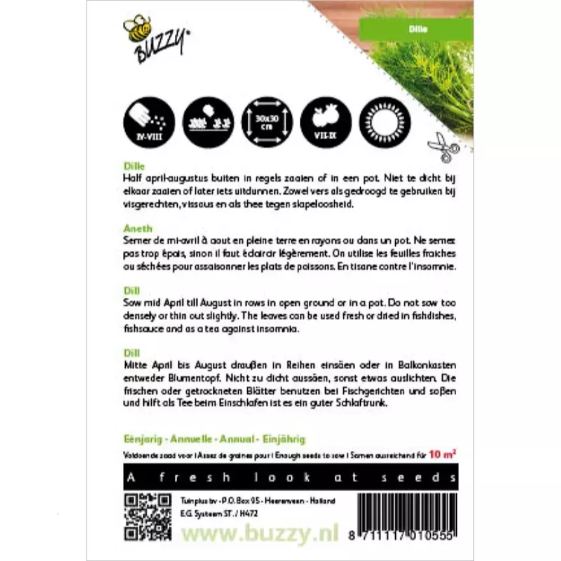 Dille_x005F_x000D_ Half april tot augustus buiten op regeltjes of in bloempotten. Niet te_x005F_x000D_ dicht zaaien, anders iets uitdunnen. Zowel vers als gedroogd blad bij alle visgerechten en sauzen en als thee tegen slapeloosheid._x005F_x000D_ _x005F_x000D_