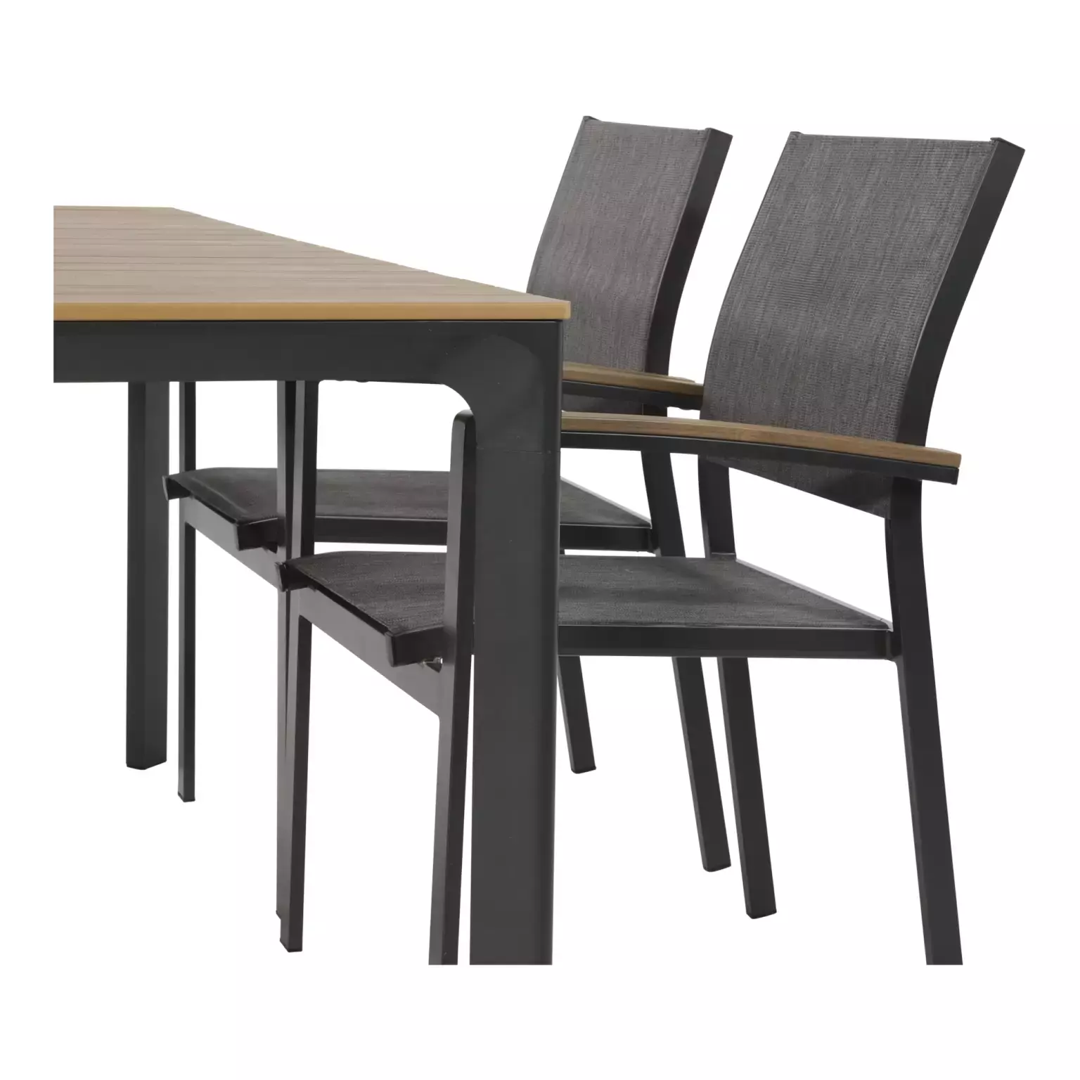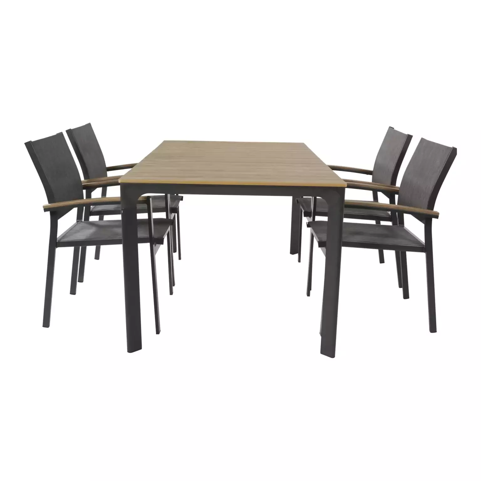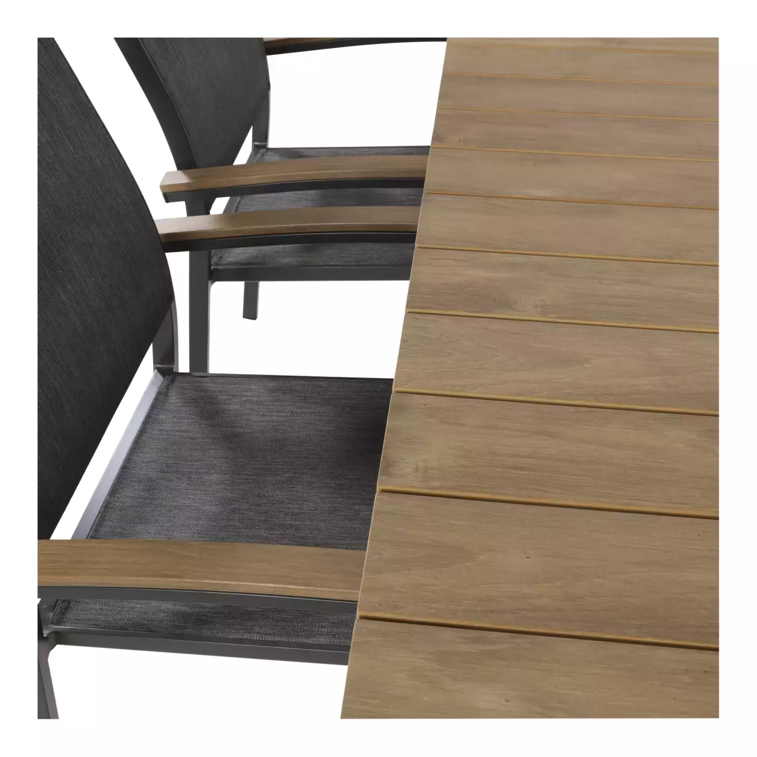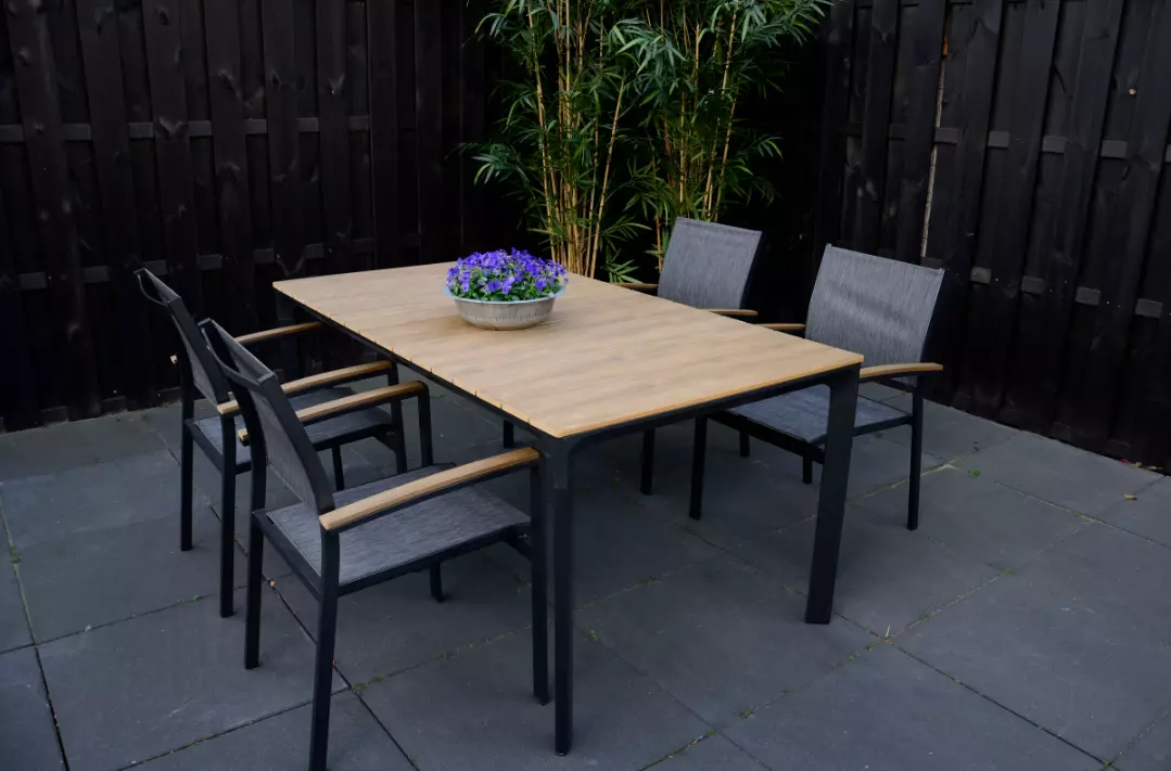 Naast de praktische voordelen van aluminium, is de Arezzo tuintafel afgewerkt met een stijlvolle teaklook. Deze combinatie van materialen geeft de tafel een moderne en toch natuurlijke uitstraling, waardoor hij perfect past in diverse tuinontwerpen. De antraciete kleur voegt een eigentijdse touch toe en is gemakkelijk te combineren met andere tuinmeubelen en accessoires.