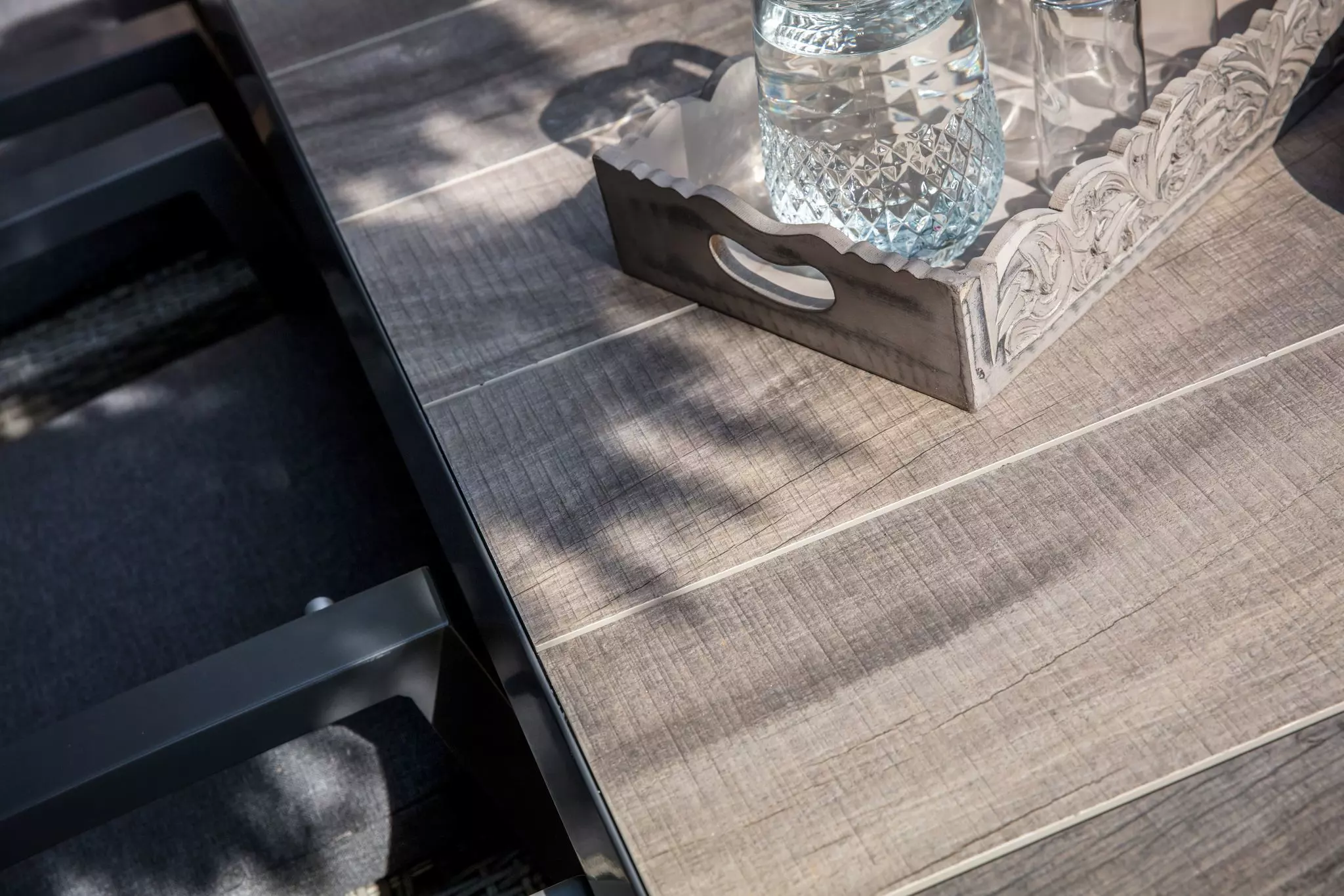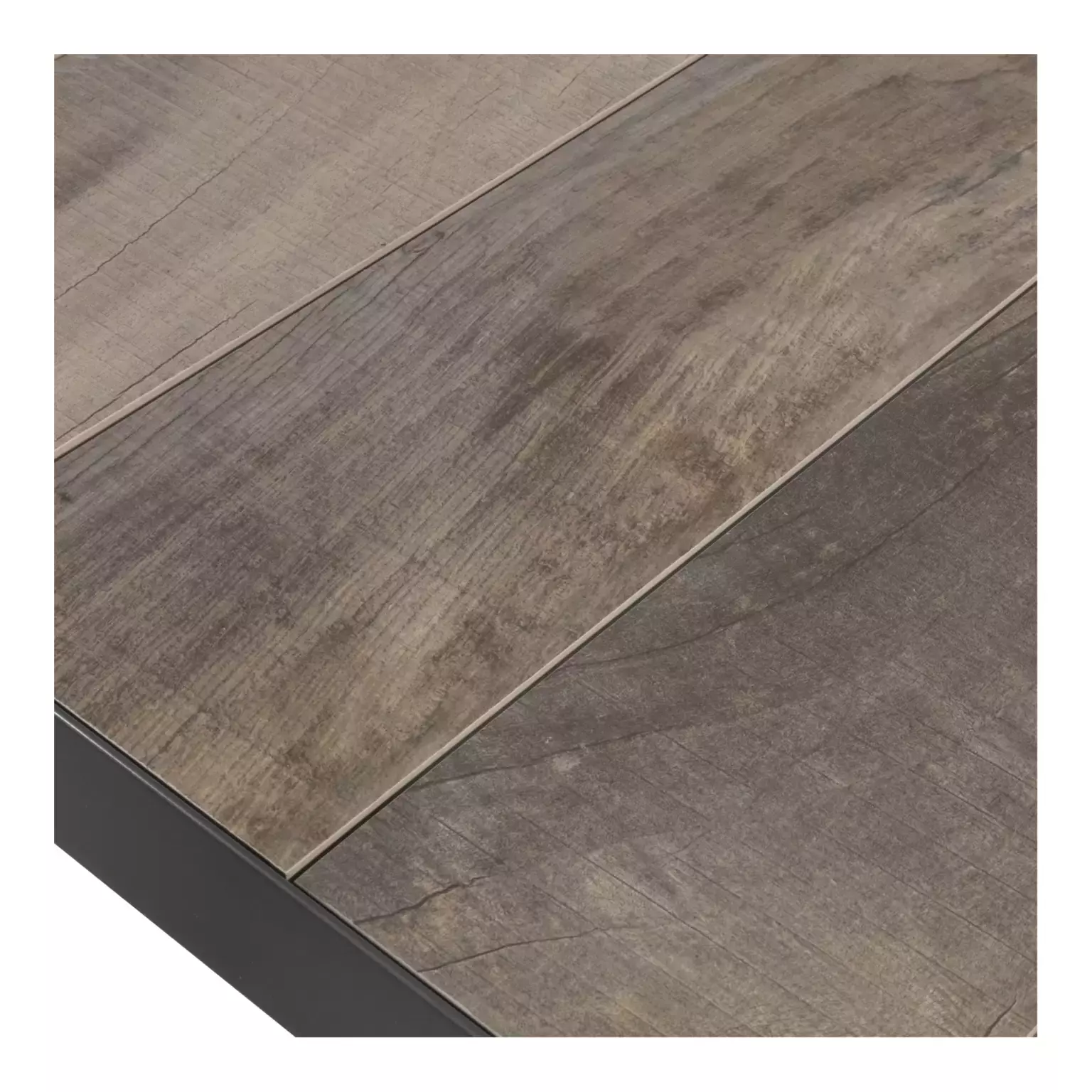 Het tafelblad heeft een aantrekkelijke houtlook die perfect aansluit bij de moderne, industriële esthetiek van de tafel. Hoewel het blad de uitstraling van hout heeft, is het gemaakt van keramiek, wat diverse praktische voordelen biedt, zoals hittebestendigheid, krasbestendigheid en eenvoudige reiniging.