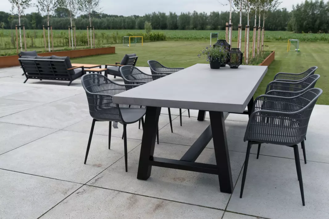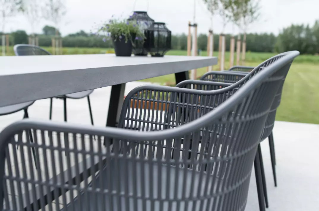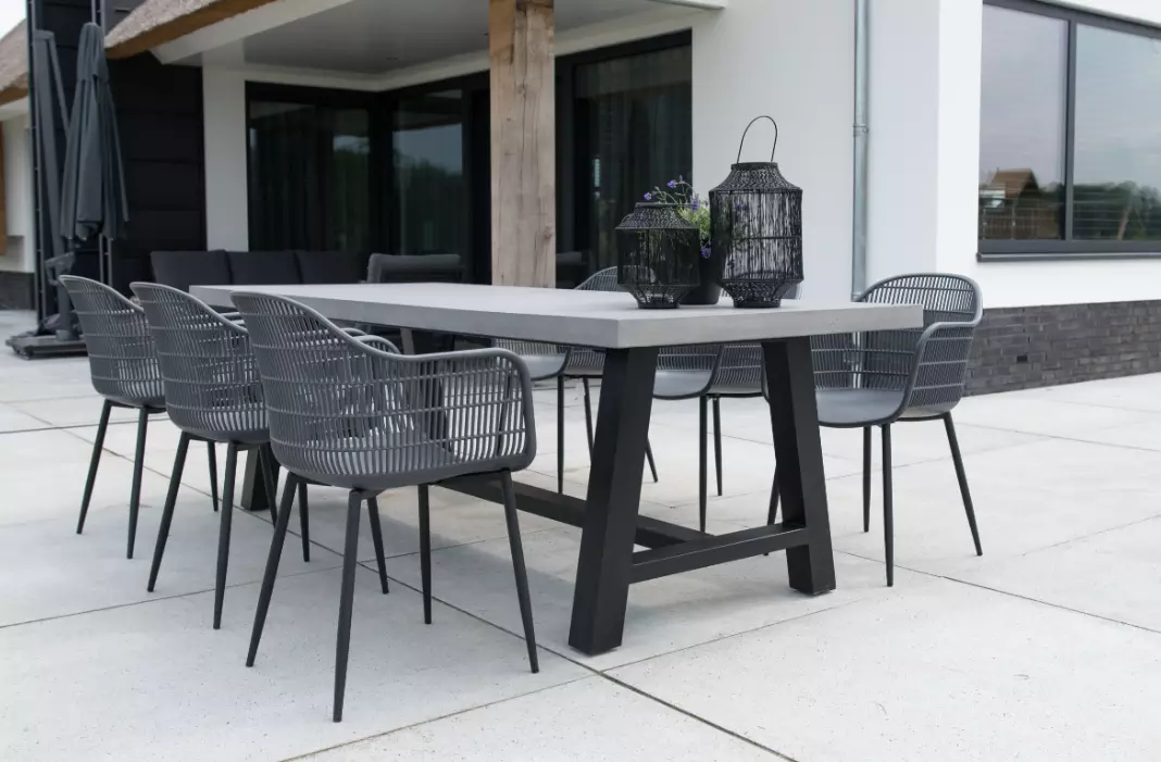 Het tafelblad is gemaakt van polystone, een innovatief materiaal dat de esthetiek van beton perfect nabootst. Polystone, een combinatie van cement en kunststofvezels, biedt de robuuste uitstraling van beton zonder het zware gewicht en de kwetsbaarheid ervan. Dit zorgt voor een stevige, duurzame tafel die bestand is tegen verschillende weersomstandigheden en jarenlang meegaat.