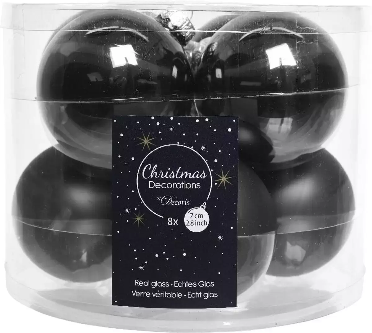 Breng een gedurfde en moderne uitstraling naar je kerstdecoraties met de Decoris Kerstballen Set in zwart. Deze set van 8 glazen kerstballen van 7 cm heeft een luxe zwarte kleur en komt in een mix van glanzende en matte afwerkingen. De zwarte kleur zorgt voor een elegante en chique uitstraling die perfect past bij een moderne kerstboom, ideaal om te combineren met andere versieringen voor een stralende en opvallende kerstboom.