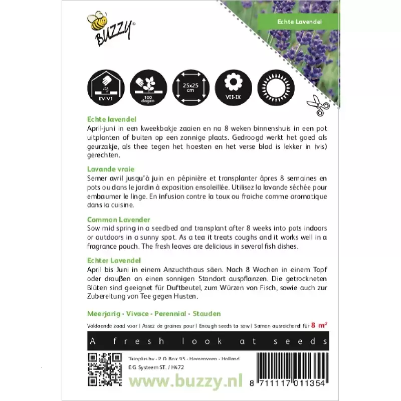 Echte lavendel_x005F_x000D_ April tot juni in een kweekbakje en na ca. 8 weken in een bak planten of_x005F_x000D_ buiten op een zonnige plaats. Gedroogd in een zakje in de linnenkast. Als_x005F_x000D_ thee o.a. tegen hoest. Vers blad bij (vis) gerechten._x005F_x000D_