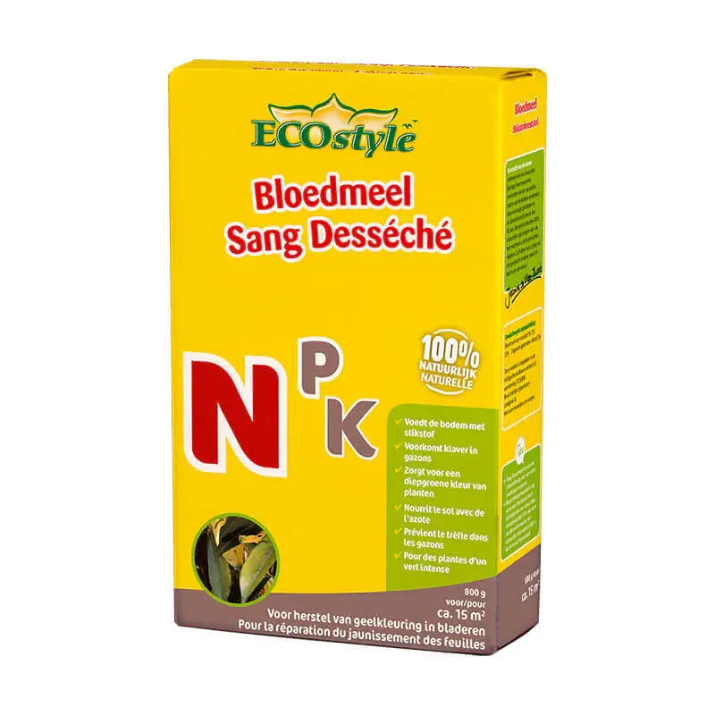 Bloedmeel is een natuurlijke stikstofmeststof, één van de drie meest essentiële voedingselementen voor planten, naast fosfaat (P) en kalium (K). Stikstof bevordert met name de groei van de groene delen van je plant. Geelverkleuring ontstaat namelijk door een tekort aan stikstof. Bloedmeel zorgt voor diepgroenere planten en voorkomt bovendien de groei van klaver in je gazon.