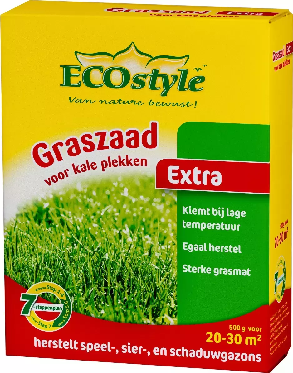 ECOstyle Graszaad-Extra is speciaal ontwikkeld voor het inzaaien van kale plekken in het gazon na het verticuteren van het gras. Aan Graszaad-Extra is een bacteriepreparaat toegevoegd. Dit preparaat zorgt ervoor dat het zaad evenwichtiger kiemt waardoor er snel een dichte grasmat ontstaat met een sterk wortelgestel. ECOstyle Graszaad-Extra is omhuld met een natuurlijke coating waardoor het graszaad minder aantrekkelijk is voor vogels.
