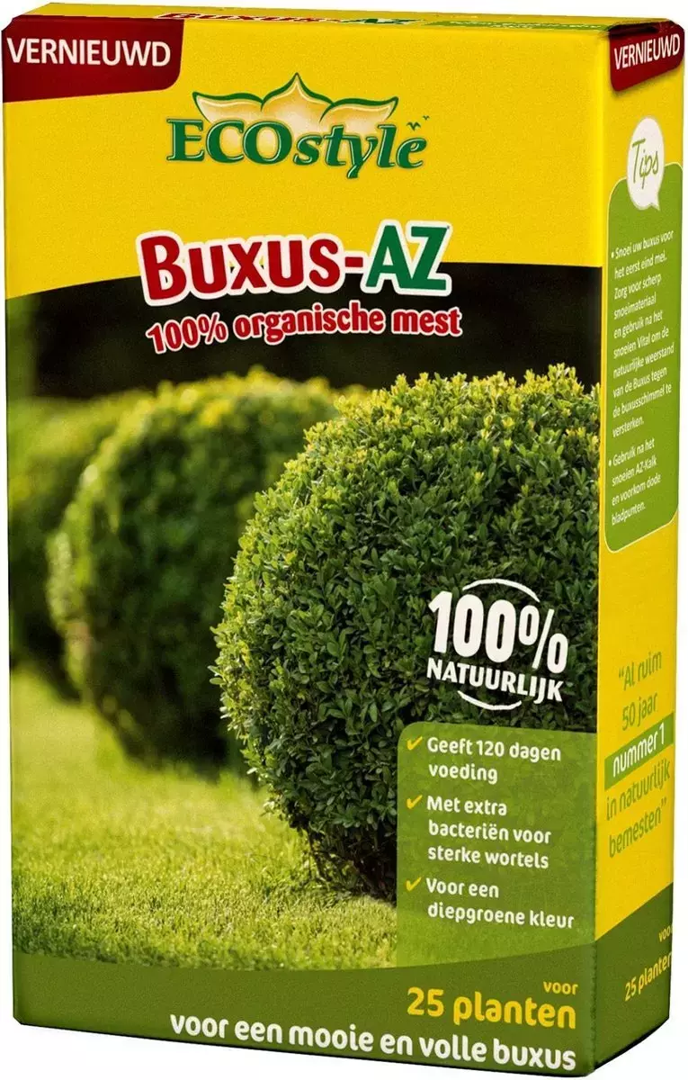 - Toepassing: Meststof voor groene planten en struiken, zoals buxus.