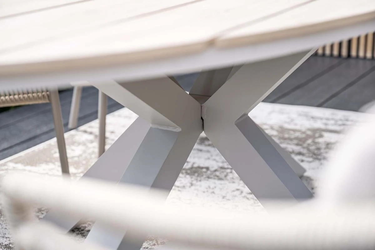 De neutrale look maakt deze tafel gemakkelijk te combineren met verschillende stoelen. Kies voor aluminium stoelen voor een moderne uitstraling, of combineer met wicker fauteuils voor een warme, romantische sfeer. Het Vironwood blad is kleurvast, stevig en eenvoudig schoon te maken met een zachte doek en mild sopje. Zo blijft de tafel seizoen na seizoen mooi, zelfs bij dagelijks buitengebruik.