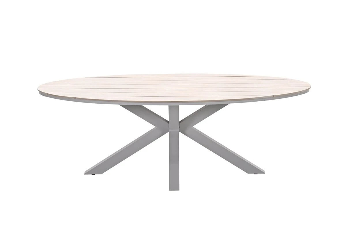 Deze ovale eettafel combineert een verfijnde uitstraling met praktisch gebruiksgemak. Met een lengte van 220 cm biedt hij genoeg ruimte voor zes stoelen, waardoor het de perfecte plek is voor gezellige diners of ontspannen momenten met familie en vrienden. Het lichte aluminium frame is voorzien van een beschermende poedercoating, waardoor de tafel roestbestendig, onderhoudsvriendelijk en duurzaam is. Het tafelblad bestaat uit Vironwood planken, een stevig kunststof met een realistische houtnerfstructuur. Zo geniet je van de warme uitstraling van hout, zonder het onderhoud dat echt hout vereist.