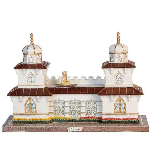Deze prachtige miniatuur toont het iconische huis van de Fakir uit de Efteling, compleet met de Fakir die sierlijk boven zijn huis zweeft op een magisch tapijt. Het huis is gedetailleerd vormgegeven, met aandacht voor de charmante elementen die je herkent uit het sprookjespark. De Fakir strooit bloemen vanuit de lucht, een geliefd beeld dat bij velen herinneringen oproept aan een bezoek aan de Efteling.