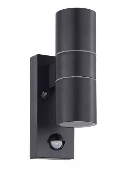 De led-buitenwandlamp RIGA 5 is gemaakt van een cilindrische, gegalvaniseerde metalen behuizing in antraciet met heldere glazen afdekkingen. De meegeleverde LED GU10 lampen geven een aangenaam warm wit licht. De buitenwandlamp is bovendien voorzien van een bewegingssensor en schakelt het licht automatisch in, moeilijk zichtbare plekken worden verlicht en ongenode gasten worden afgeschrikt. De geïntegreerde schemersensor meet de omgevingshelderheid en schakelt het licht alleen in als het echt nodig is. Dankzij de spatwaterbescherming (IP44) is de lamp zonder meer geschikt voor gebruik buitenshuis. Dankzij het up- en downlight in een modern design past de buitenwandlamp in bijna elke buitenruimte en biedt indirecte en stijlvolle verlichting aan de huismuur.
