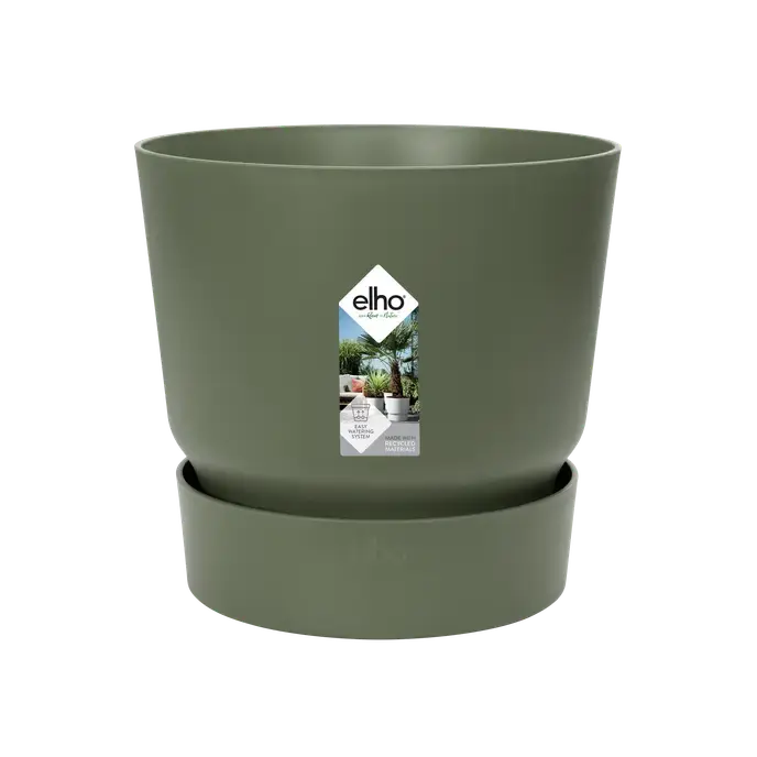 De Elho Greenville pot van 14 cm in groen is gemaakt van 100% recyclebaar polypropyleen, duurzaam, en ideaal voor het verfraaien van je interieur of tuin met zijn praktische ontwerp en milieuvriendelijke materiaal.