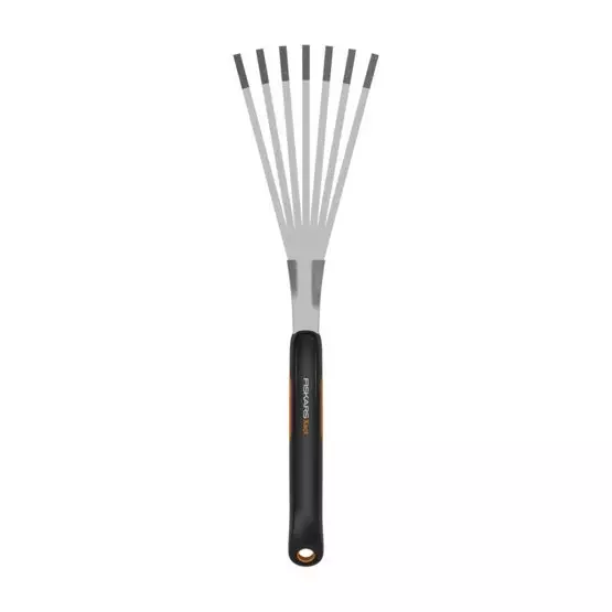 De handhark van Fiskars is ideaal om blad en onkruid op te harken uit vooral moeilijk bereikbare plekken in de tuin. Dit komt mede door de rvs kop met 7 tanden die zorgt voor precisie.