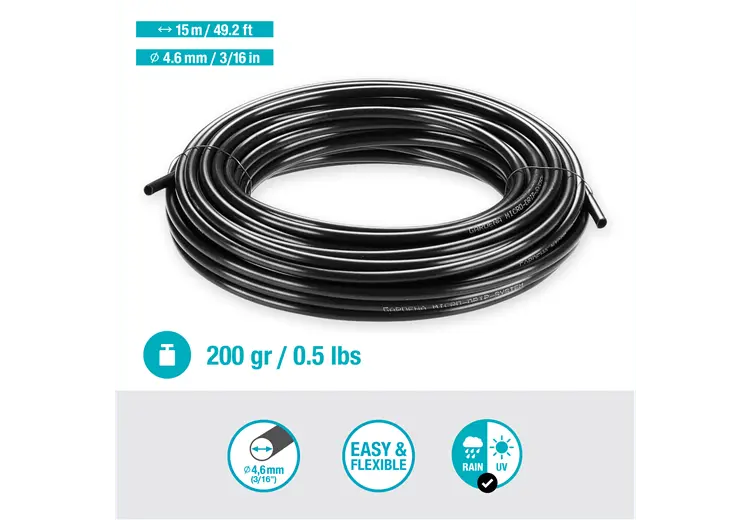 Met de 15 meter lange Aanvoerbuis 4,6 mm (3/16") van GARDENA kun je specifieke delen van het Micro-Drip-System vertakken en aanpassen, bijvoorbeeld voor gebruik op balkons en terrassen. Deze aanvoerbuis fungeert als een betrouwbare verbinding tussen de waterkraan en de gemonteerde druppelaars en sproeiers, waardoor je planten direct van water worden voorzien.