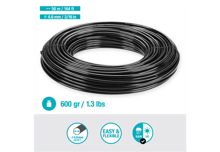 De GARDENA Aanvoerbuis met een diameter van 4,6 mm (3/16") en een lengte van 50 meter is de perfecte oplossing voor het installeren of verlengen van het Micro-Drip-System in grote tuinen. Met deze lange aanvoerbuis kun je betrouwbaar water naar gemonteerde sproeiers en druppelaars transporteren, rechtstreeks naar je planten.