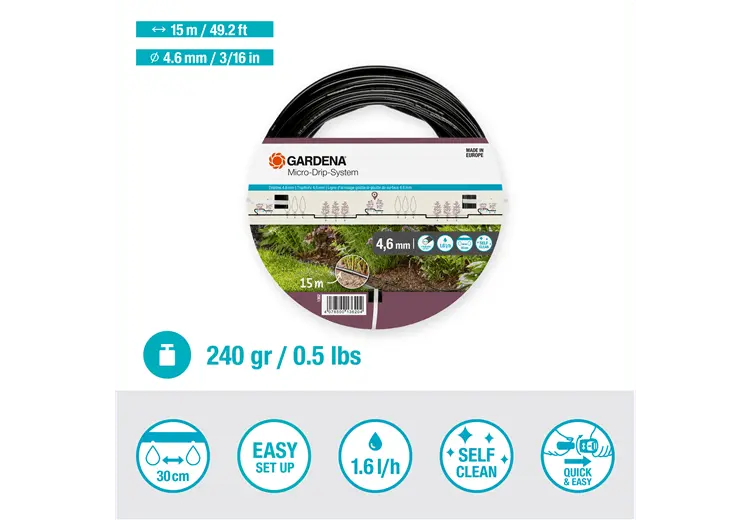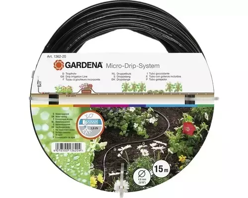 De 15 meter lange Druppelbuis 4,6 mm (3/16") van GARDENA biedt een betrouwbare en waterbesparende druppelbewatering voor kleinere plantenrijen en gevoelige gewassen zoals buxussen, bloembedden en delicate planten. Deze buis is speciaal ontworpen om te worden gecombineerd met de apart verkrijgbare Micro-Drip-Bewatering Gewassen/Plantenrijen Set van GARDENA.