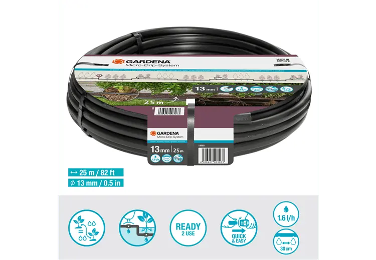 De GARDENA Druppelbuis voor bovengrondse en ondergrondse installatie is ontworpen voor efficiënte bewatering van plantenrijen zoals heggen, struiken en buxussen over een lengte van 25 meter. Deze waterbesparende druppelbuis is ideaal als aanvulling op de twee Micro-Drip-Bewatering Sets Heggen/Struiken (art-nr. 13500-20 en 13501-20) van GARDENA.