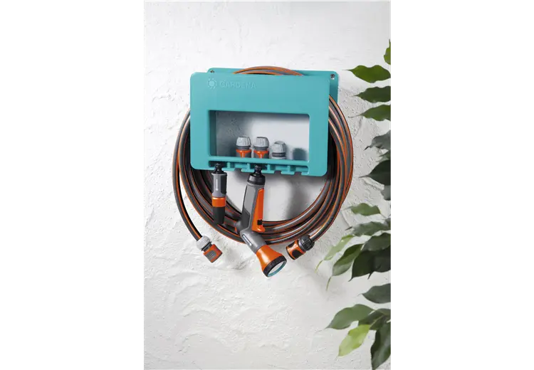 De GARDENA System slanghouder is een praktische ophangmogelijkheid voor uw tuinslang. U kunt uw slang snel en eenvoudig opbergen. De slanghouder heeft tevens een houder voor Original GARDENA System aansluitstukken en ophangmogelijkheden voor spuiten en broezen. Altijd bij de hand als u ze nodig heeft!