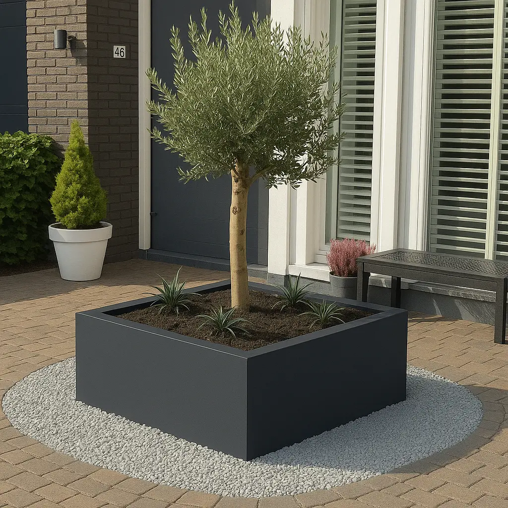 Dankzij het open bodemontwerp is deze plantenbak ideaal voor optimale drainage en directe plaatsing op aarde, wat de wortelgroei bevordert. De duurzame poedercoating beschermt tegen alle weersomstandigheden, waardoor de plantenbak jarenlang zijn verfijnde uitstraling behoudt zonder te roesten.