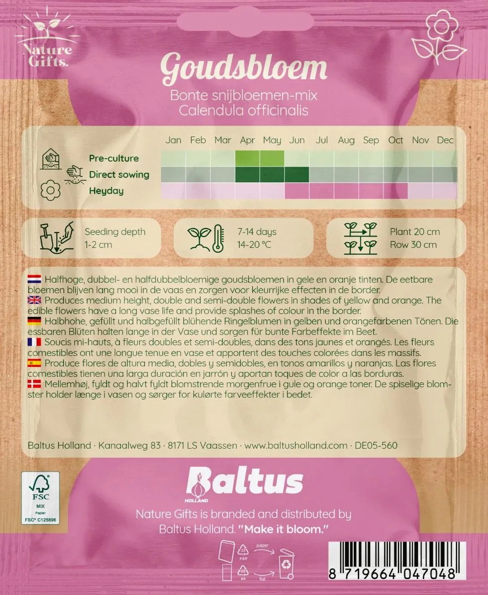 Goudsbloem bonte snijbloemenmix. Grote bloemen in warme geel- en oranje tinten. Planten tussen april en juni. Bloeit tussen juni en oktober.
