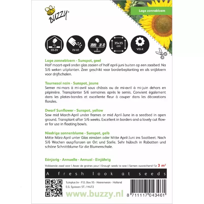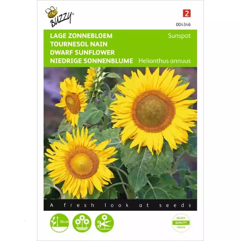 Lage zonnebloem - Sunspot, geel_x000D_ Half maart-april onder glas zaaien of half april-juni buiten op een zaaibed. Na 5/6 weken uitplanten. Zeer geschikt voor borderbeplanting en als snijbloem voor drijfschalen._x000D_ _x000D_ _x000D_