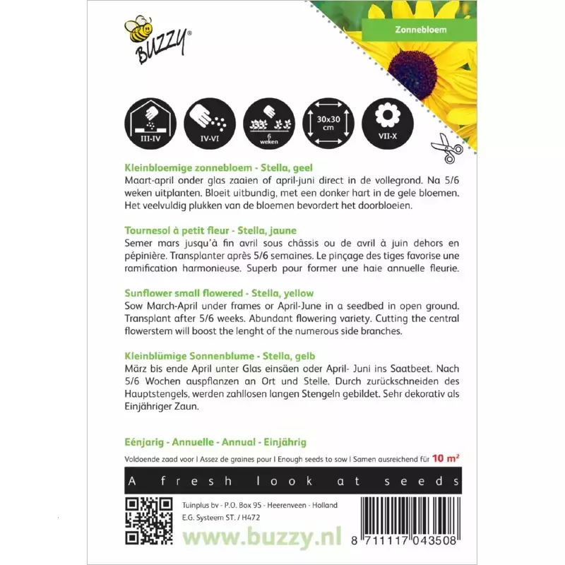 Kleinbloemige zonnebloem - Stella, geel_x000D_ Maart-april onder glas zaaien of april-juni direct in de vollegrond. Na 5/6_x000D_ weken uitplanten. Bloeit uitbundig, met een donker hart in de gele bloemen._x000D_ Het veelvuldig plukken van de bloemen bevordert het doorbloeien._x000D_ _x000D_