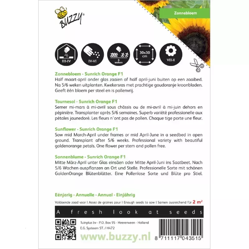 Zonnebloem - Sunrich Orange F1_x000D_ Half maart-april onder glas zaaien of half april-juni buiten op een zaaibed._x000D_ Na 5/6 weken uitplanten. Kwekersras met prachtige goudoranje kroonbladen._x000D_ Geeft één bloem per steel en is pollenvrij._x000D_