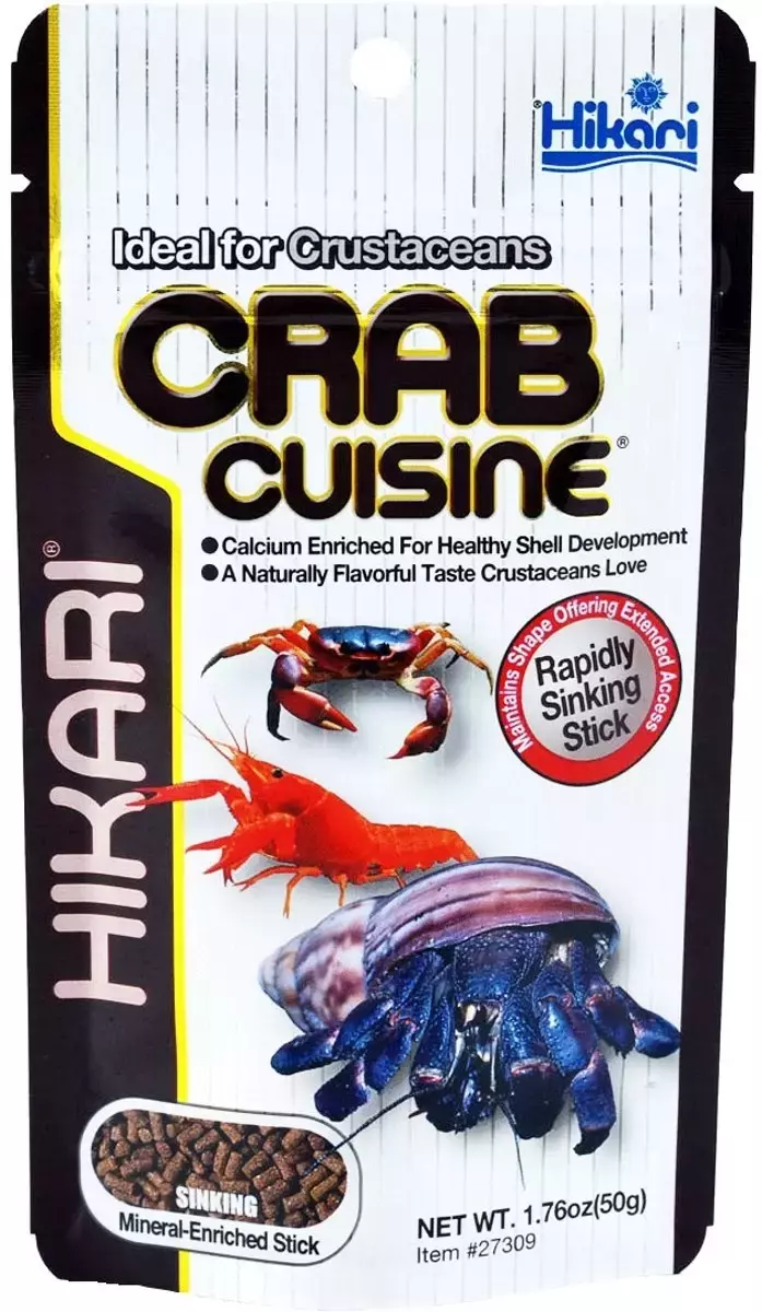 Hikari Crab Cuisine is een uniek voer wat ontworpen voor zee- en zoetwaterschaaldieren zoals, kreeften en krabben, bijvoorbeeld Heremietkreeften en Rivierkreeften. De Hikari Crab Cuisine is een speciaal ontwikkeld visvoer om precies te kunnen zien hoeveel jouw schaaldieren eten in jouw aquarium, om zo watervervuiling te voorkomen. Crab Cusine is een harde ministick die gemakkelijk naar de schuilplaats meegenomen kan worden om daar te worden opgepeuzeld. Het hoge gehalte aan verrijkt calcium bevordert de ontwikkeling van de schaal als natuurlijke bescherming tegen roofdieren en ziektes. Het voer zinkt snel en blijft in zijn vorm. De meeste schaaldieren zijn gek op dit soort voer, zoals bijvoorbeeld; Heremietkreeften en Rivierkreeften.
