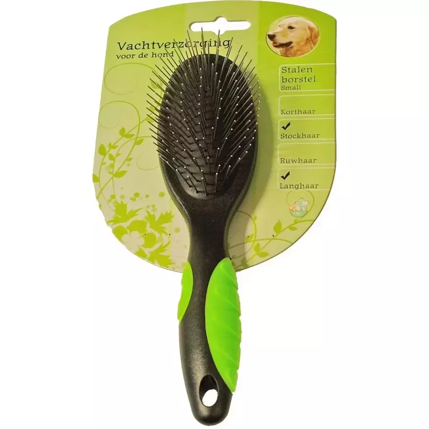 De Hondenborstel stalen pen is geschikt voor alle langharige honden, de borstel is zwart met groen en heeft stalen borstelharen.