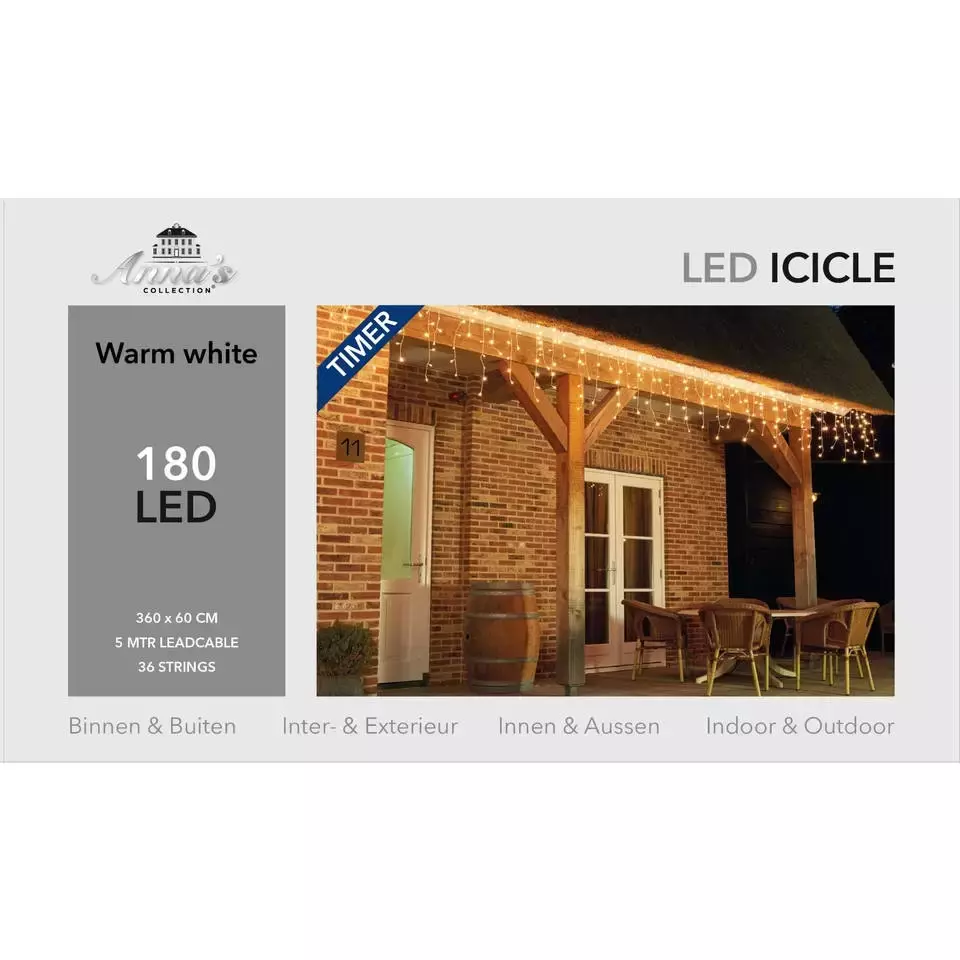 Deze ijspegelverlichting heeft 180 lampjes, een snoerlengte van 3,6m en de kleur warm wit. De verlichting is geschikt voor zowel binnen als buiten en de 'ijspegels' gaan tot een lengte van 60cm.