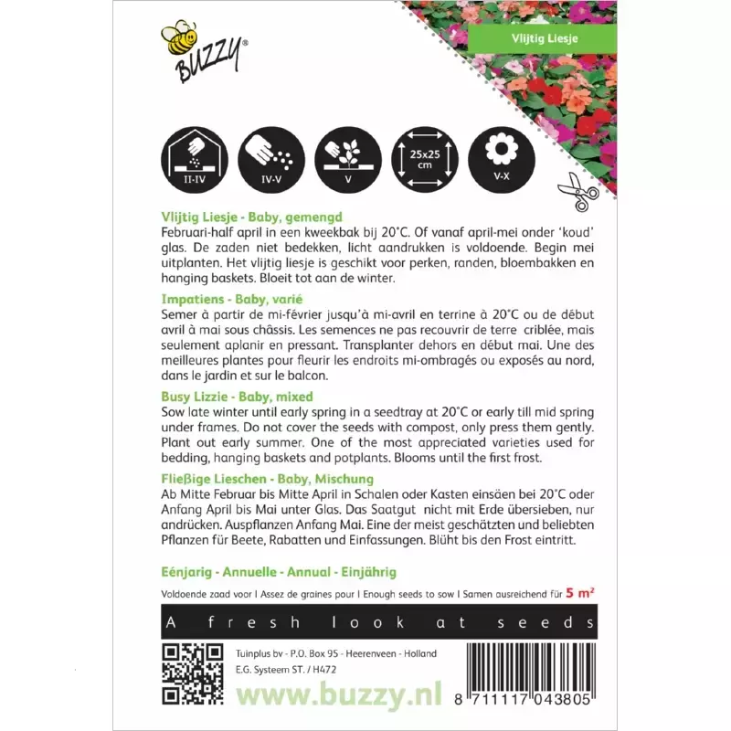 Vlijtig Liesje - Baby, gemengd_x000D_ Februari-half april in een kweekbak bij 20°C. Of vanaf april-mei onder ‘koud’_x000D_ glas. De zaden niet bedekken, licht aandrukken is voldoende. Begin mei_x000D_ uitplanten. Het vlijtig liesje is geschikt voor perken, randen, bloembakken en_x000D_ hanging baskets. Bloeit tot aan de winter._x000D_