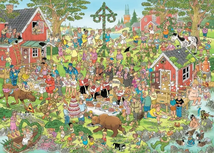 Ontdek de Jan van Haasteren "Midzomerfeest" puzzel en geniet van de humor en chaos die zich afspeelt op dit levendige midzomerfeest!