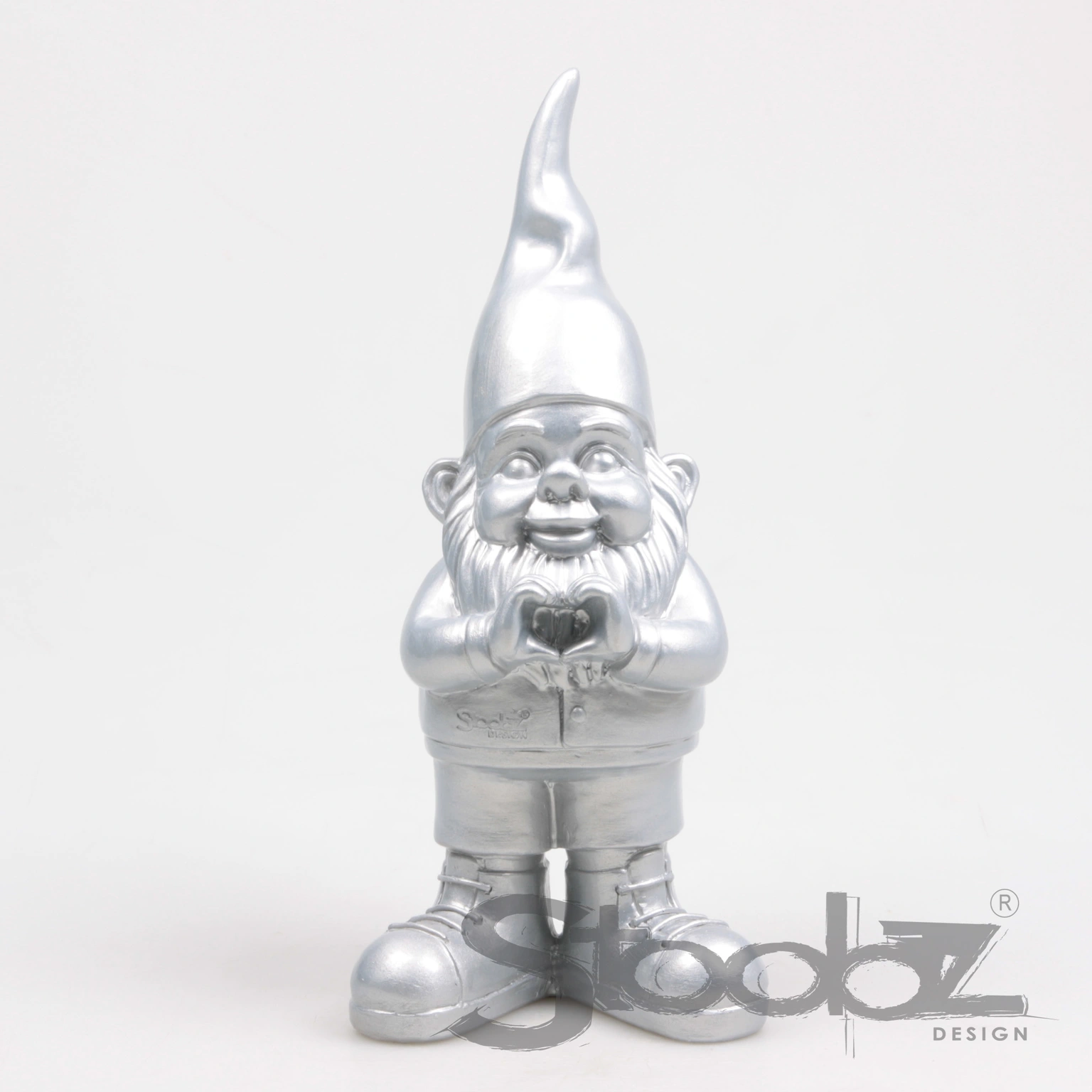 De Stoobz "Hart" kabouter in zilver is de ideale keuze voor wie houdt van strakke lijnen en een vleugje glamour in de tuin. Deze karaktervolle gnome vormt met zijn handen een hart, wat in combinatie met de reflecterende zilveren finish zorgt voor een prachtig contrast. Met een hoogte van 29,5 cm is het een opvallend decoratiestuk voor elk terras.