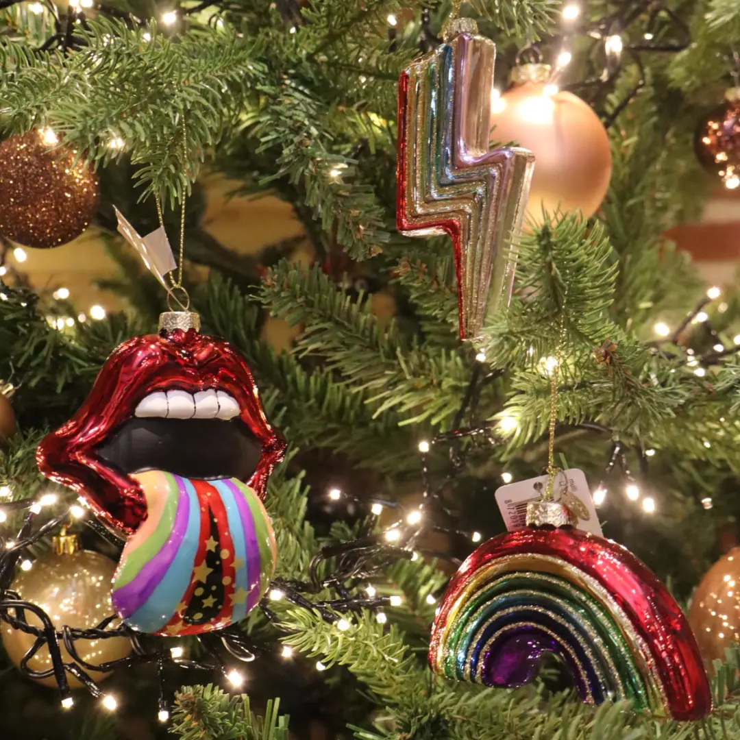 Mond met Tong Regenboog: Laat een glimlach op ieders gezicht verschijnen met deze vrolijke bal. Met zijn kleurrijke mond en uitbundige tong brengt hij een speelse en humoristische touch aan je kerstversiering.