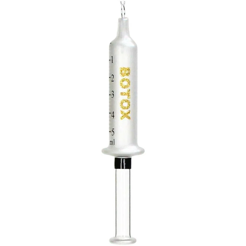 Een opvallend en eigentijds ornament: de witte botox-spuit van glas. Perfect voor wie een grappige knipoog wil toevoegen aan de kerstboom, of voor professionals in de cosmetische wereld die hun passie willen laten zien tijdens de feestdagen.