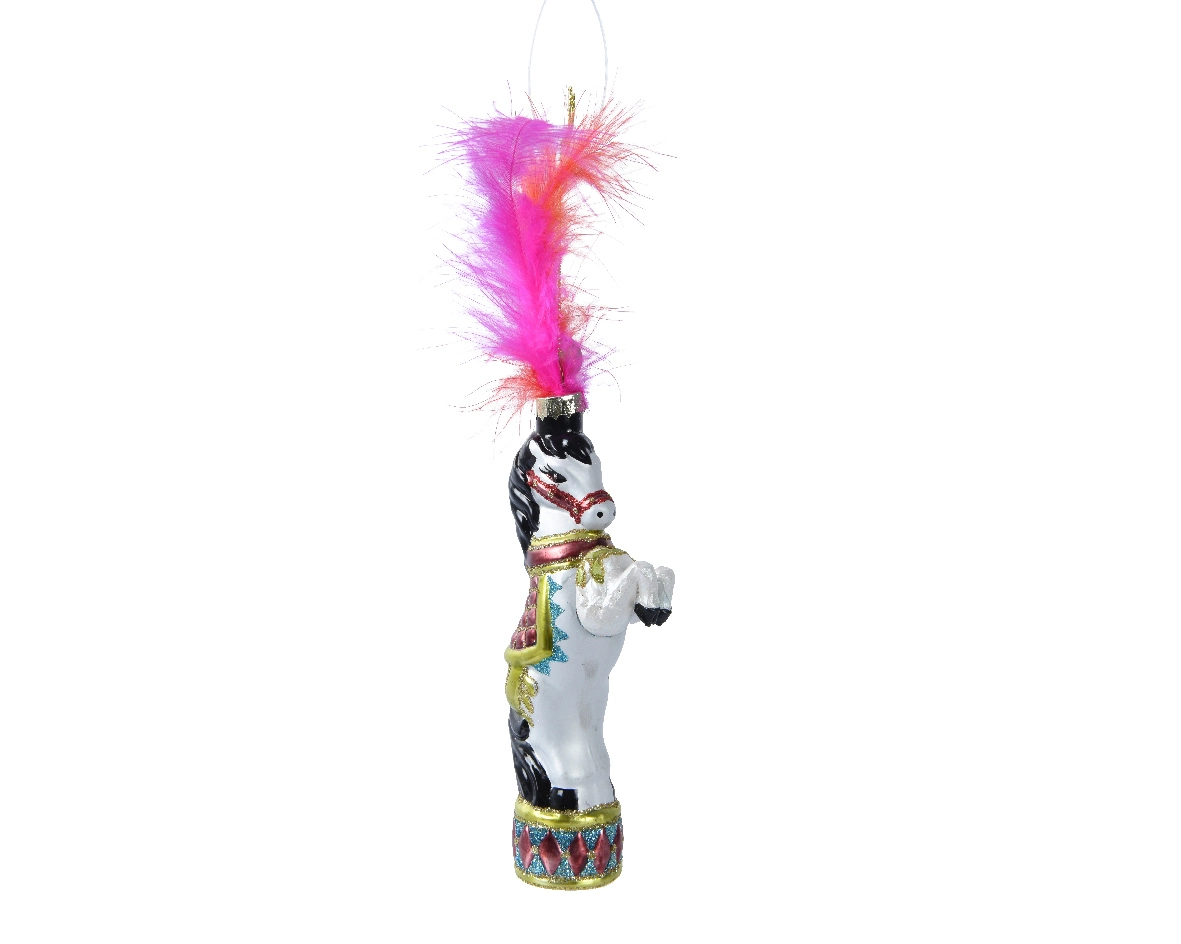 De Kersthanger Paard in de afmetingen 5 x 3,3 x 17 cm is een unieke en speelse toevoeging aan je kerstdecoratie. Deze prachtige hanger toont een circuspaard, volledig aangekleed in een kleurrijk kostuum, dat trots op een verhoging staat. Het ontwerp is gedetailleerd en levendig, waardoor het een opvallend element in je kerstboom of andere decoratieve arrangementen is.