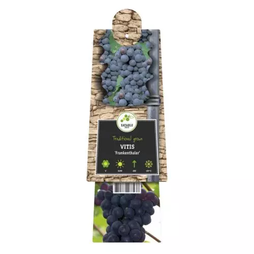 Druiven zijn klimplanten voor een zonnige, warme plek, en moeten tegen een trellis of draad kunnen groeien. Ze houden van kalk, en zijn zelfbestuivend. Snoei druiven in januari in vorm. Vroeg in de zomer, wanneer zichtbaar is waar de trossen hangen, kunt u eventueel het laatste stuk van de ranken (waar geen vruchten meer zitten) weg snoeien. Voor minder, maar grotere druiven kunt u ook de helft van de trosjes weghalen. Frankenthaler is een zoete sappige druif met ronde vruchten aan grote trossen, die in augustus afrijpen. Mest van maart tot juni regelmatig met druivenmest.
