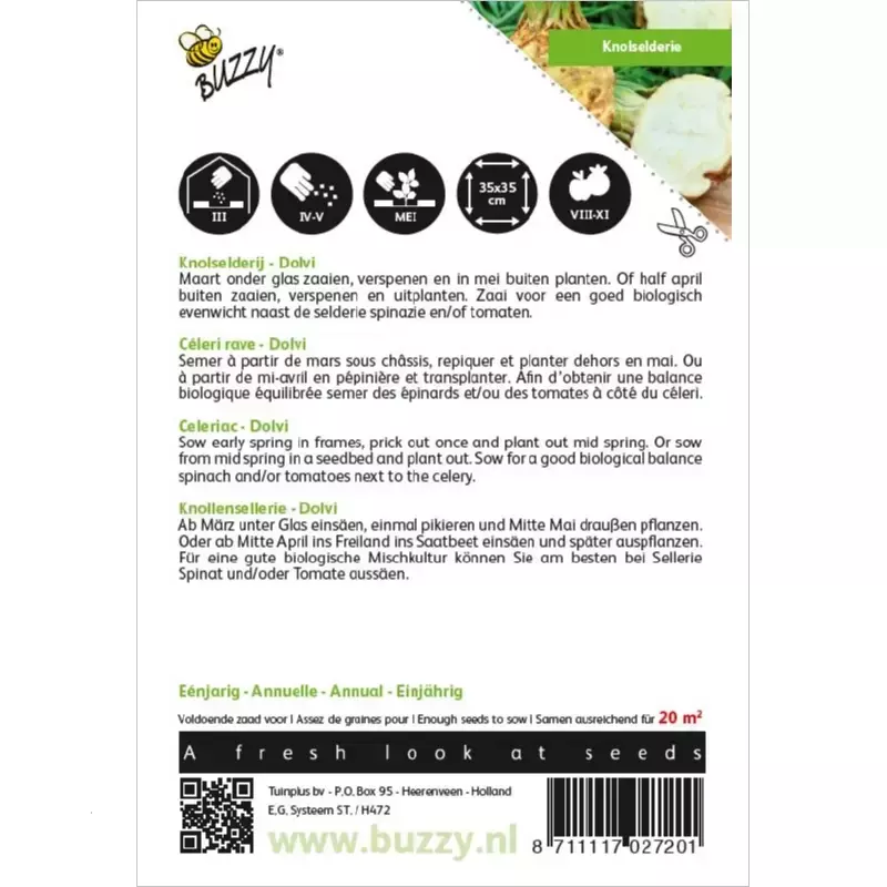 Knolselderij - Dolvi_x005F_x000D_ Maart onder glas zaaien, verspenen en in mei buiten planten. Of half april_x005F_x000D_ buiten zaaien, verspenen en uitplanten. Zaai voor een goed biologisch_x005F_x000D_ evenwicht naast de selderie spinazie en/of tomaten.