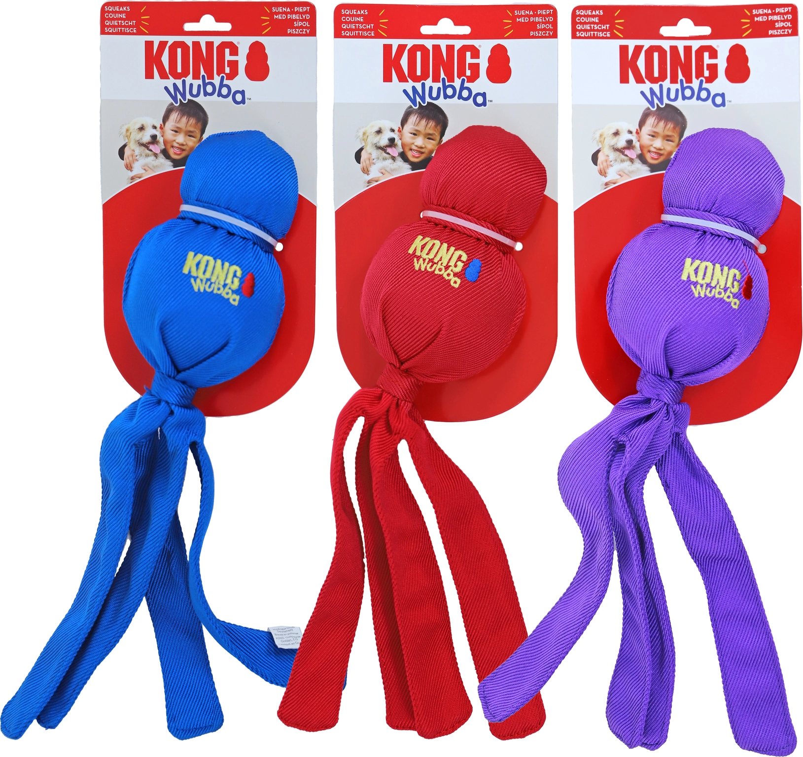 De KONG Wubba is het ideale interactieve speeltje voor gooi- en trekspelletjes met je hond. Dit grappige en duurzame speeltje is bedekt met onverslijtbare, verstevigde nylon stof en combineert twee ballen in één: een tennisbal bovenop en een piepbal onderop.
