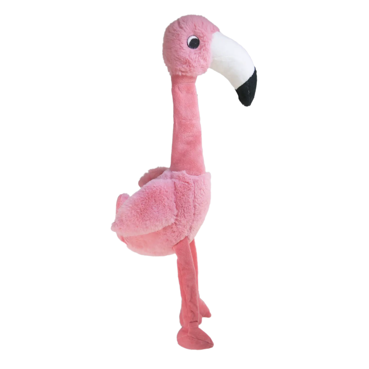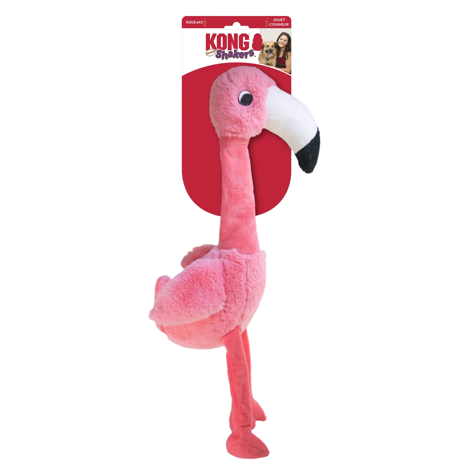 De roze Kong Shakers Honkers Flamingo is een lang pluchen speeltje, perfect voor interactieve spelletjes, met een textuur in de interne nek die de natuurlijke kauwinstincten van honden bevredigt, terwijl de lange, slappe poten zorgen voor schud- en trekspelletjes; dankzij de lage pieper en het verstevigde pluche design blijven honden langer geamuseerd spelen met dit flamingofiguur, ideaal voor apporteer plezier en het bevorderen van langdurig speelplezier