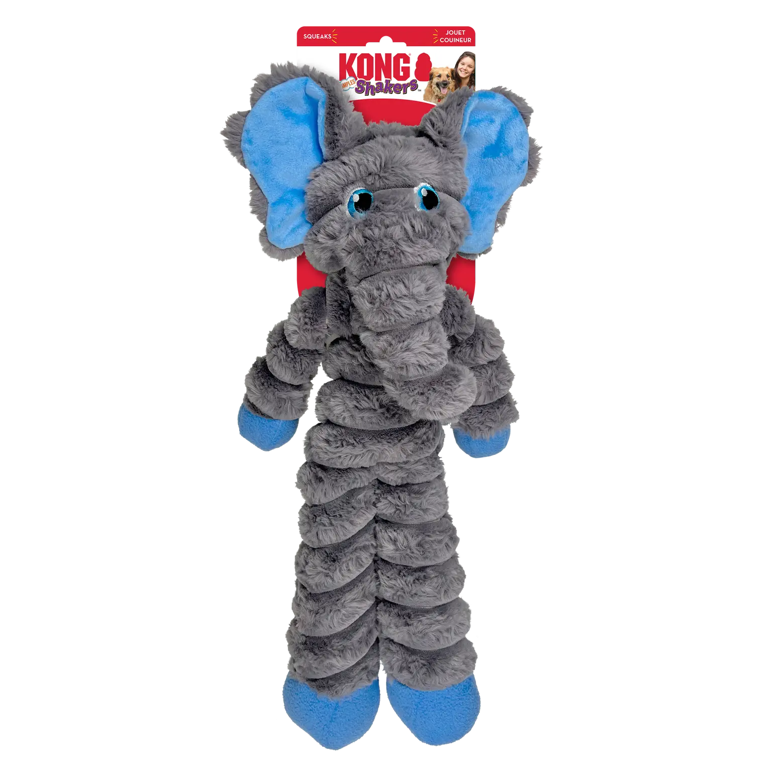 De KONG Shakers Crumples Olifant biedt eindeloos speelplezier dankzij zijn gigantische formaat en lange, slappe lijf. Dit speeltje is perfect voor honden die graag hun natuurlijke instincten volgen door te schudden, trekken en apporteren. De unieke grommende pieper in het lijf, gecombineerd met knisperende armen en piepende voeten, houdt honden urenlang geboeid.