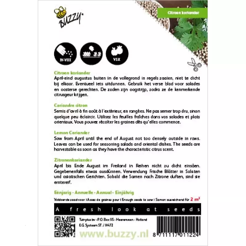 Citroen Koriander_x005F_x000D_ April tot eind augustus buiten op regeltjes; niet te dicht zaaien, anders iets_x005F_x000D_ uitdunnen! Gebruik: vers blad voor salades en oosterse gerechten; zodra de_x005F_x000D_ zaden naar citrus gaan geuren zijn ze oogstrijp._x005F_x000D_ _x005F_x000D_