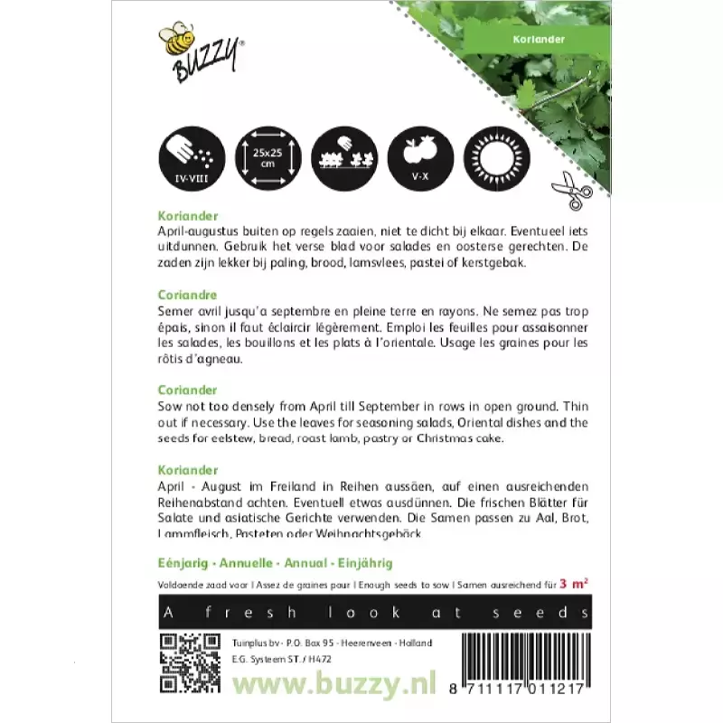 Koriander_x005F_x000D_ April tot en met augustus buiten op regeltjes; niet te dicht zaaien, anders iets_x005F_x000D_ uitdunnen! Gebruik: vers blad voor salades en oosterse gerechten; de zaden_x005F_x000D_ bij paling, brood, lamsvlees, pasteien en kerstgebak._x005F_x000D_