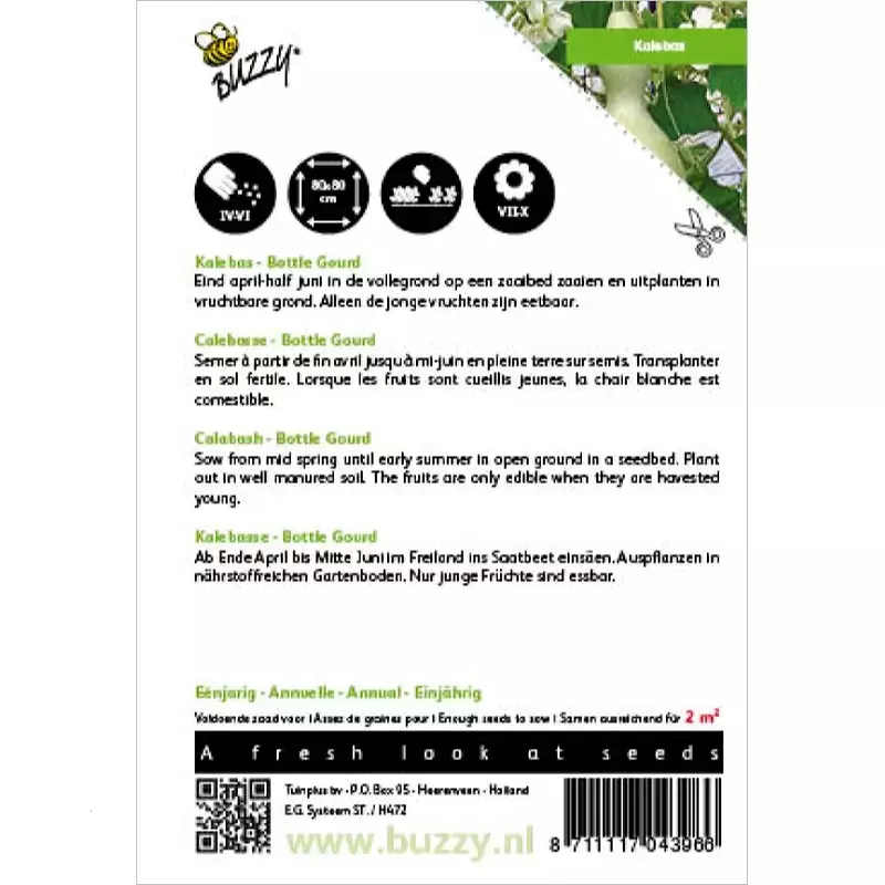 Kalebas - Giant Bottle_x000D_ Vanaf eind april tot half juni in de vollegrond op een zaaibed en uitplanten in_x000D_ vruchtbare grond. Eetbaar mits jong geplukt!_x000D_