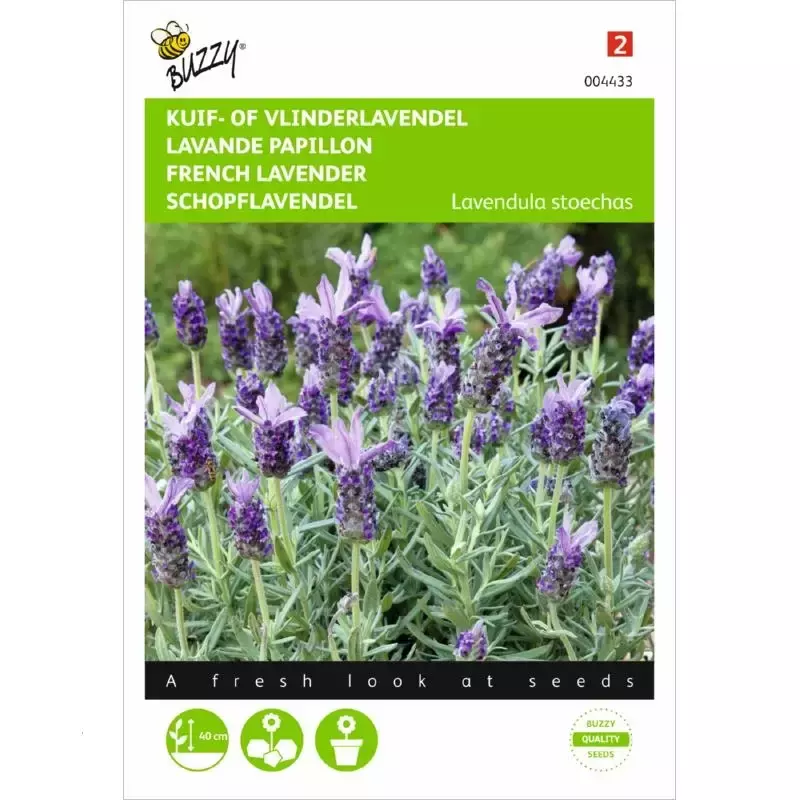Kuif- of Vlinderlavendel_x000D_ April-juni in een kweekbak zaaien. Na 8 weken in een bak of in de vollegrond_x000D_ uitplanten op een zonnige plaats. Geschikt voor bloembakken, potten en in_x000D_ de rotstuin. Na de bloei snoeien en niet bemesten. Heeft weinig water nodig.