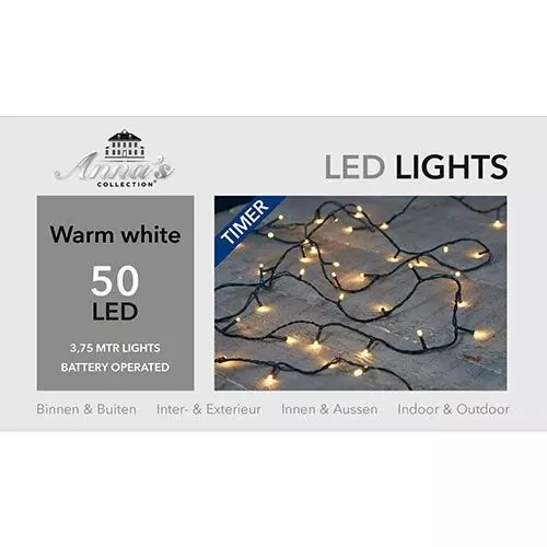 Zwarte lichtsnoer met 50 led lampjes. De lichtsnoer werkt op batterijen. Er zit een timer op de verlichting, de verlichting staat 8 uur aan en 16 uur uit. De snoer is 3,75 meter lang en kan zowel binnen als buiten gebruikt worden.