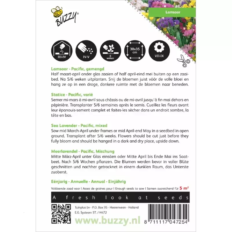 Lamsoor - Pacific, gemengd_x000D_ Half maart-april onder glas zaaien of half april-eind mei buiten op een zaaibed._x000D_ Na 5/6 weken uitplanten. Snij de bloemen juist vóór de volle bloei en_x000D_ hang ze op in een droge, donkere ruimte met de bloemen naar beneden.