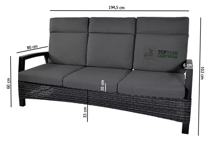 Met afmetingen van 194,5 x 80 x 102 cm biedt de Prato Forte voldoende ruimte om te ontspannen. De armleuningen, met een hoogte van 60 cm en een breedte van 6 cm, zijn ergonomisch ontworpen voor extra comfort en ondersteuning. De zithoogte van 33 cm (exclusief kussens) zorgt voor een natuurlijke en ontspannen zitpositie, perfect voor lange gesprekken en gezellige momenten met vrienden en familie.