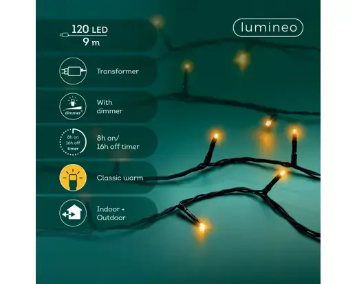 Op zoek naar stralend mooie kerstverlichting? Toptuincentrum heeft precies wat je nodig hebt! De kerstverlichting van Lumineo zorgt ervoor dat jouw kerstboom elk jaar stralend voor de dag komt. Aan dit lange kerstsnoer hangen maar liefst 120 kleine LED-lampjes, ook wel "ricelights" genoemd, die een warme, klassieke sfeer in huis of tuin brengen. Deze LED-verlichting is ontworpen voor zowel binnen- als buitengebruik, zodat je zelfs je tuin in een feestelijke ambiance kunt hullen.