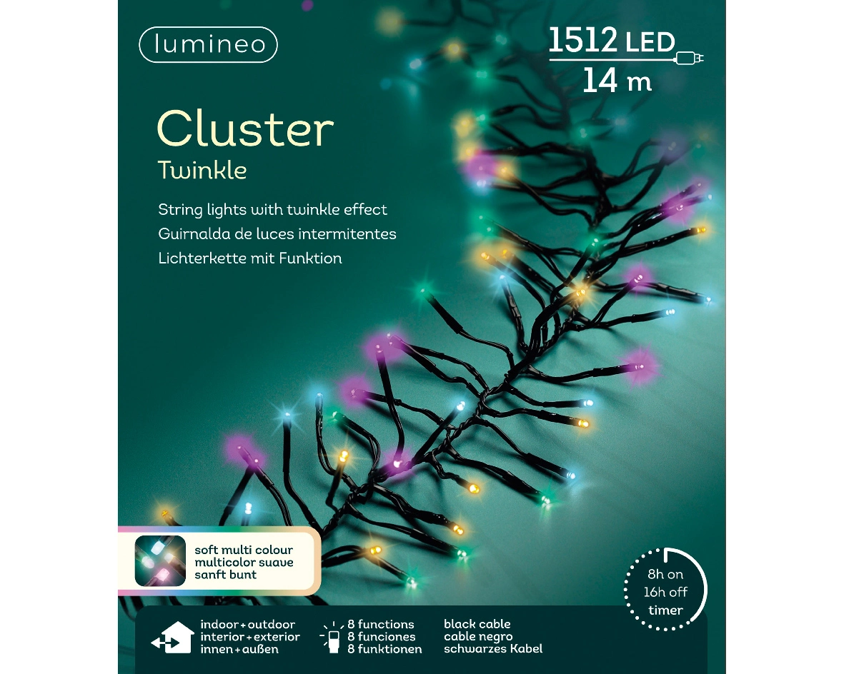 Breng een magische en feestelijke sfeer in je huis met de Lumineo Cluster Verlichting. Dit lichtsnoer is 14 meter lang en bevat maar liefst 1512 LED-lampjes, die in clusters dicht op elkaar zijn geplaatst. Deze opstelling zorgt ervoor dat jouw kerstboom of decoratie rijkelijk gevuld is met licht, wat een indrukwekkende uitstraling geeft.