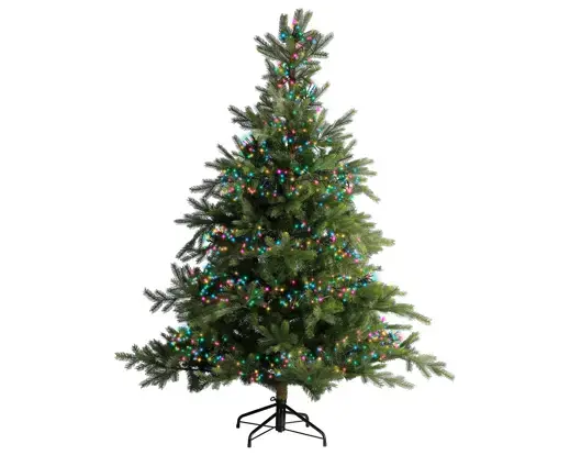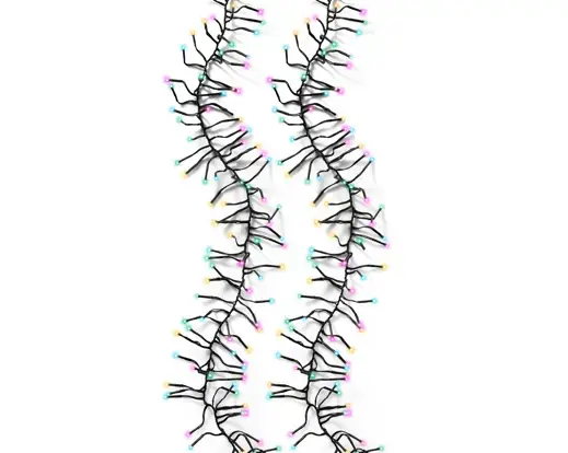 De lampjes stralen in een zachte, multi-colour tint die een speels en kleurrijk effect creëert, perfect voor het toevoegen van een vrolijke sfeer tijdens de feestdagen. Of je nu je kerstboom, een guirlande, een krans of zelfs de buitenkant van je huis wilt versieren, deze verlichting is veelzijdig genoeg voor elke decoratieve toepassing. Het zwarte snoer valt discreet weg tussen de takken of langs de gevel, waardoor de focus volledig op de levendige lampjes ligt.