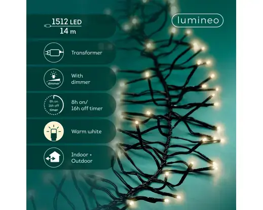 Deze Lumineo clusterverlichting heeft 1512 lampjes, een snoerlengte van 14m en de kleur warm wit. Het voordeel van deze verlichting is dat het een timer en een dimmer heeft. De verlichting is geschikt voor zowel binnen als buiten.